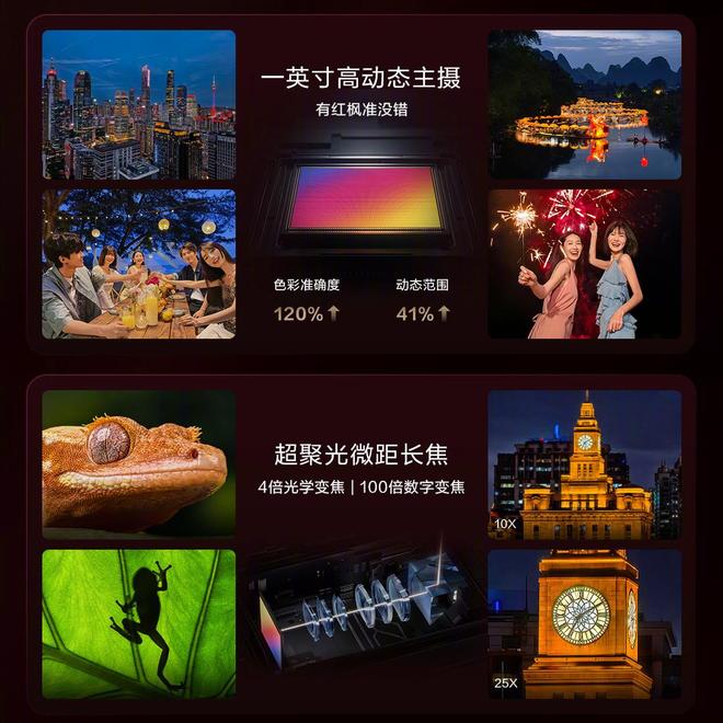 前置1300万像素摄像头,后置5000万主摄(1英寸,F1.6-F4.0,OIS)+4000万超广角+4800万长焦微距(F2.1、OIS)+150万多光谱通道红枫四摄组合,核心卖点是1英寸超大底主摄、个性色卡、红枫原色影像和4倍光学变焦等功能。其中Pro+机型主摄拥有更高的动态范围,能够带来更强的光线捕捉能力,带来更出色的夜景体验和高动态夜景视频。